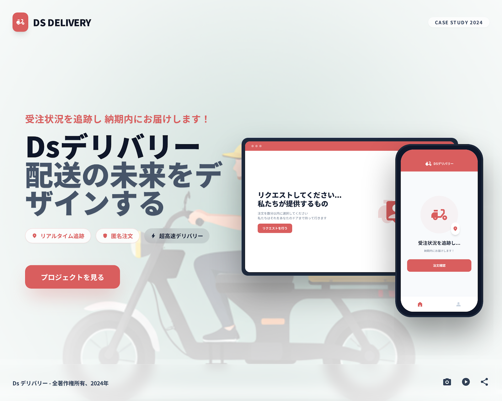 DS Deliveryは、アカウント登録不要で注文可能なWeb注文システムと、配達員向けモバイルアプリを統合したオンデマンド配達プラットフォームです。